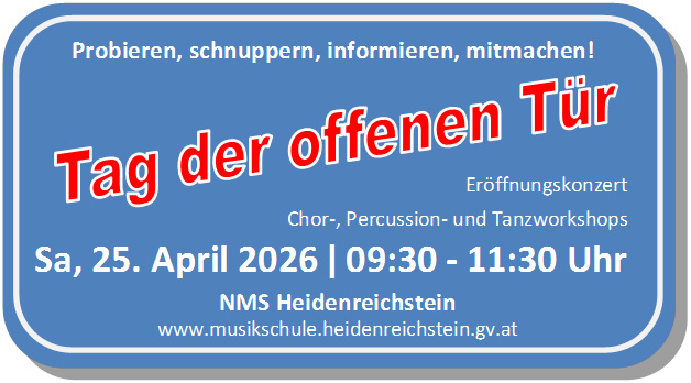 Am „Tag der offenen Tür“ haben Interessierte die Möglichkeit, Instrumente auszuprobieren, bei Chor- und Tanzworkshops mitzumachen, die Lehrer kennenzulernen sowie sich über das Angebot und die Anmeldung zu informieren. Beim Eröffnungskonzert in der Aula der NMS Heidenreichstein machen Ensembles der Musikschule Lust auf mehr!